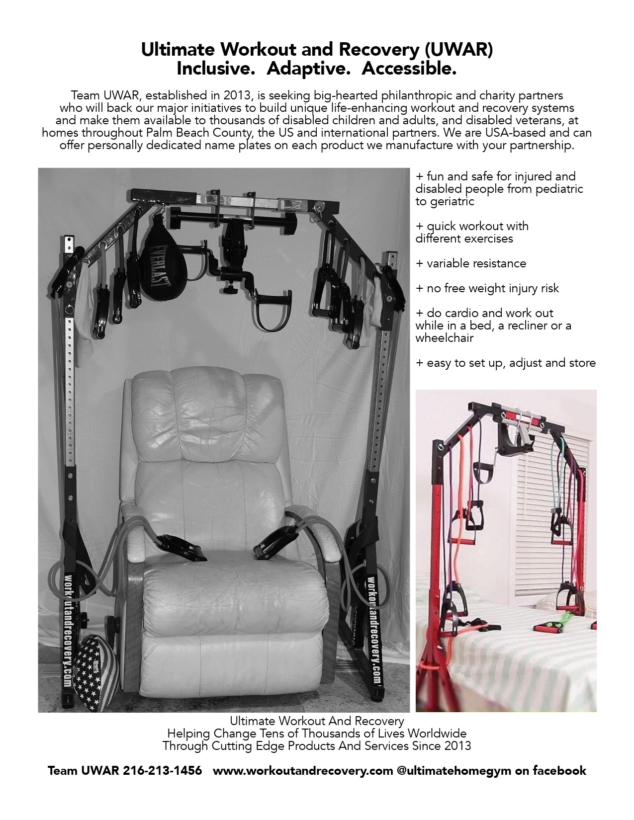 The made in USA cutting-edge Ultimate Workout and Recovery System (UWAR) boasts 30 exercise and rehab uses for anyone to utilize wanting safe, convenient and
