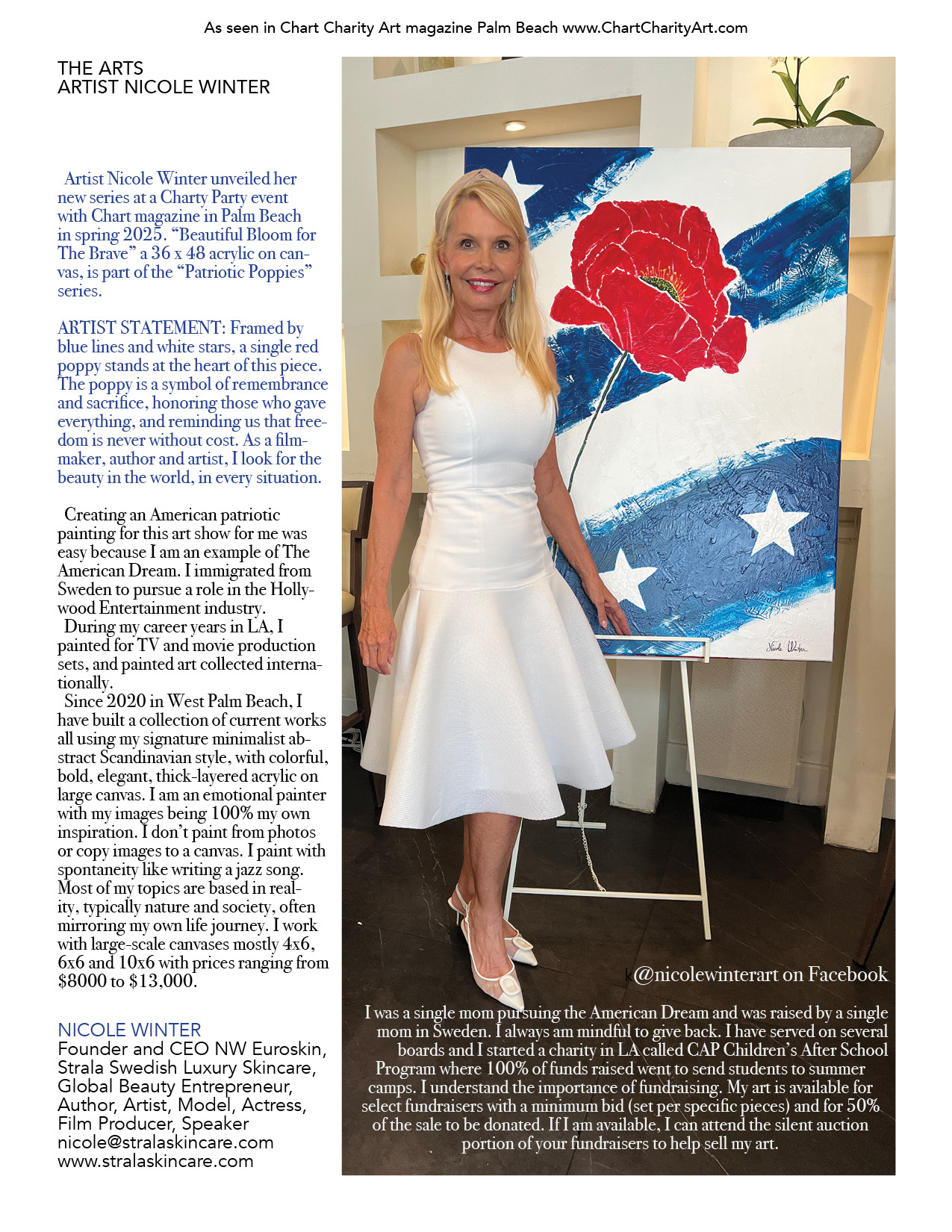 Nicole Winter, the CEO of NW Euroskin and the founder of Stråla Swedish Luxury Skincare based in West Palm Beach, has a new autobiographical book and has added to her newest series of art. Her art will be featured at a Charty Party soon!