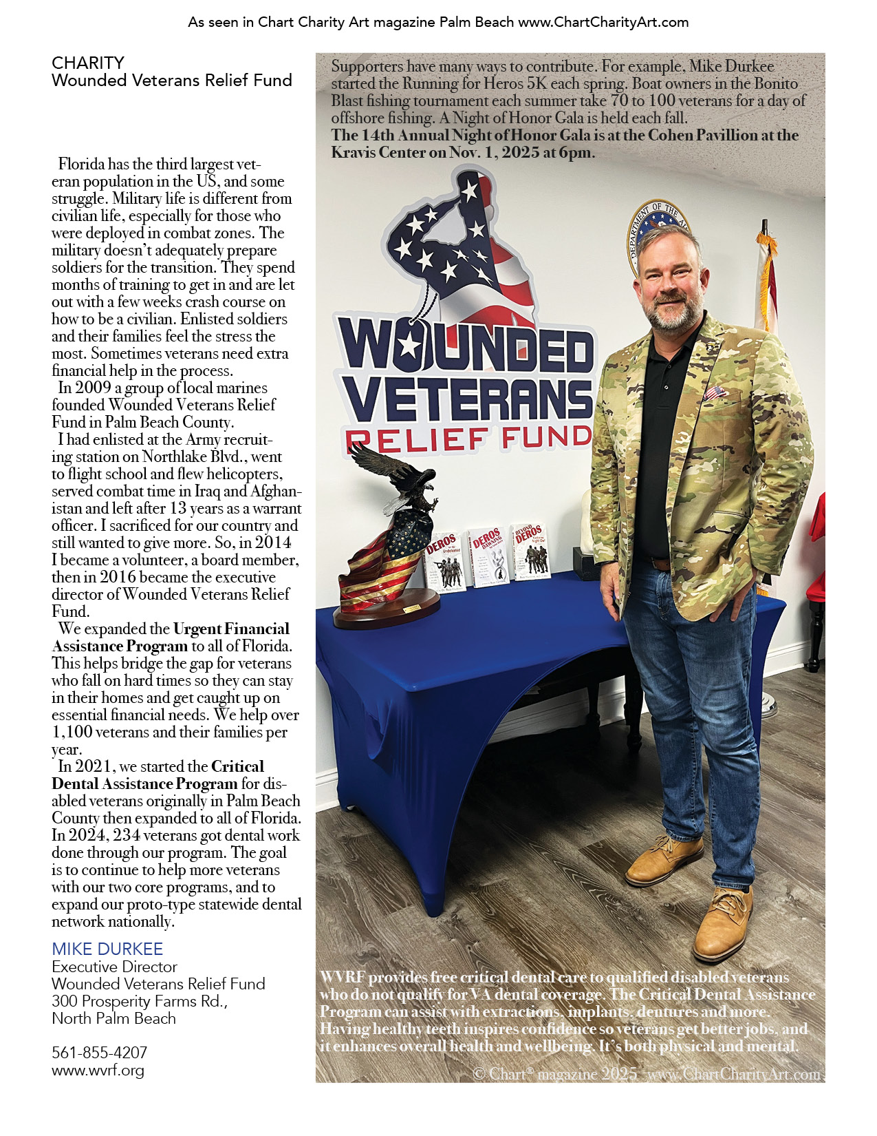 Mike Durkee became the executive director of North Palm Beach-based Wounded Veterans Relief Fund in 2016. Under his leadership they did a statewide expansion of the Urgent Financial Assistance Program to bridge the gap for veterans in need for housing, transportation and other essential financial needs. In 2021, they launched the Critical Dental Assistance Program for disabled veterans in Palm Beach County then expanded to all of Florida. Their goal is to continue to help more veterans with their two core programs, and to expand the dental network nationally.